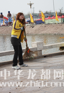 2010年4月2日,我在淮陽太昊陵廟會上,拍到了一個女孩與環(huán)衛(wèi)工人一起勞動的畫面,她不是專業(yè)的環(huán)衛(wèi)工人,但卻做起了太昊陵的“美容師”。