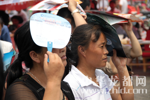 一考生家長拿著宣傳單遮陽。