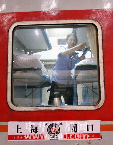 ????在K1505次列車13號車廂,記者見到了這節(jié)車廂的乘務(wù)員張靜逸。乘客一進站登車,張靜逸的工作就開始了——為乘客檢票。真正的忙碌是在乘客上車后,張靜逸負(fù)責(zé)12號和13號兩個臥鋪車廂,每個車廂核載66人,列車開出后,她要先為乘客一一換票,然后,帶上手套,拿著塑料袋,來回穿梭在列車過道中清理車廂內(nèi)的垃圾。張靜逸一路上都在重復(fù)這些工作。