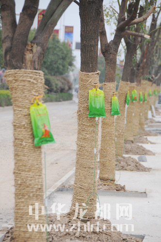 行道樹(shù)集體“打點(diǎn)滴”,是生病了,還是有別的原因?當(dāng)日上午,記者來(lái)到周口大道與慶豐路交叉口,看到路旁幾十棵新種植的小樹(shù)全部掛上了綠色吊瓶(如圖),上面寫(xiě)著“大樹(shù)AG營(yíng)養(yǎng)針液”。綠化工人在樹(shù)干上鉆一個(gè)小洞,然后把營(yíng)養(yǎng)液的軟管放在里邊。扎針、綁膠帶、調(diào)節(jié)輸液器,小樹(shù)像極了病人。