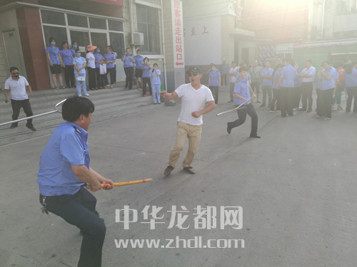 ????在防恐防暴的演練中,兩名手持兇器的歹徒在車站大廳里轉(zhuǎn)悠,車站值班站長見此情況后,想方設(shè)法穩(wěn)定住兩名歹徒,隨后一邊安排工作人員疏散候車廳內(nèi)旅客,一邊組織工作人員拿起警棒、防爆叉與歹徒進行搏斗(如圖四)。