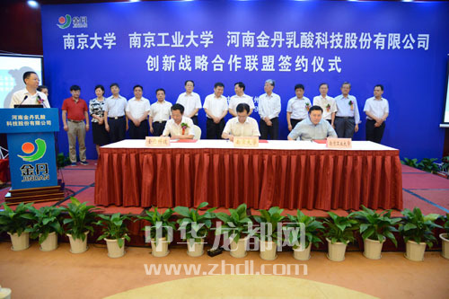 ????本報(bào)訊(記者 李莉) 7月9日上午,南京大學(xué)、南京工業(yè)大學(xué)、河南金丹乳酸科技股份有限公司創(chuàng)新戰(zhàn)略合作聯(lián)盟簽約儀式在鄭州舉行。副省長(zhǎng)張維寧,中國(guó)工程院院士張全興,南京大學(xué)副校長(zhǎng)談?wù)苊簦暇┕I(yè)大學(xué)副校長(zhǎng)喬旭,省科技廳廳長(zhǎng)張震宇,市委書(shū)記、市人大常委會(huì)主任徐光,省環(huán)保廳副廳長(zhǎng)師偉,市委常委、常務(wù)副市長(zhǎng)劉保倉(cāng),市委常委、組織部長(zhǎng)靳磊,副市長(zhǎng)王田業(yè),及鄲城縣主要領(lǐng)導(dǎo)、河南金丹乳酸公司主要負(fù)責(zé)人出席簽約儀式。