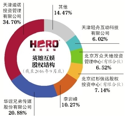 據(jù)英雄互娛三季報(bào),華誼兄弟持有公司2.89億股,占比20.88%,為公司第二大股東。英雄互娛第一大股東為天津迪諾投資管理有限公司,其持有公司34.7%股份。