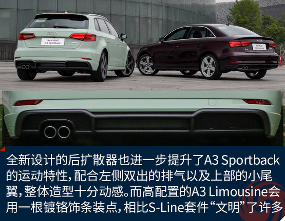 全新設(shè)計(jì)的后擴(kuò)散器也進(jìn)一步提升了A3 Sportback的運(yùn)動特性,配合左側(cè)雙出的排氣以及上部的小尾翼,整體造型十分動感。而高配置的A3 Limousine會用一根鍍鉻飾條裝點(diǎn),相比S-Line套件“文明”了許多。與LED矩陣大燈相呼應(yīng)的是全LED尾燈,兩者相輔相成為新車帶來了更強(qiáng)的攻擊性以及橫向視覺延展性,新加入的流動式轉(zhuǎn)向燈在美觀的同時(shí)也提升了整車的科技感。