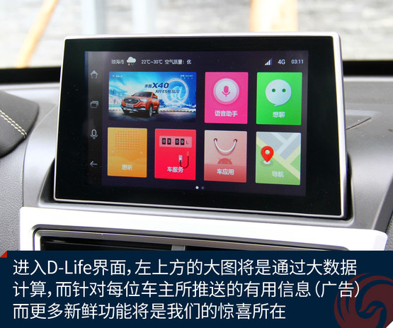 不過(guò)跟奔騰X40接觸兩天之后,會(huì)發(fā)現(xiàn)它大可不必在對(duì)手林立的市場(chǎng)中血拼顏值,靠實(shí)力不俗的獨(dú)門絕技一樣能夠輕松獲得一席之地。既然面向年輕用戶,豐富的車載娛樂(lè)系統(tǒng)很關(guān)鍵。大屏幕、手機(jī)互聯(lián)等等似乎已經(jīng)是這類車的標(biāo)配。奔騰X40更進(jìn)一步,所搭載的D-Life系統(tǒng)讓我們看到了它引領(lǐng)潮流的勁頭。
