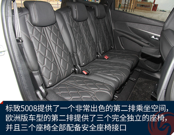 作為一款7座中型SUV,標致5008最受關注的一點就是車內(nèi)空間的體驗了,這里我就來多講一講。首先,標致5008提供了一個非常出色的第二排乘坐空間,不夸張的說2840毫米的軸距基本上就是在為第二排乘客服務的。歐洲版車型的第二排提供了三個完全獨立的座椅,并且三個座椅全部配備安全座椅接口,而國產(chǎn)車型將會改為4/6分隔的座椅類型。