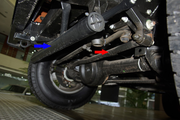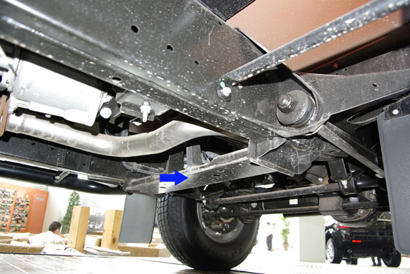 ????后軸特寫圖二,藍色箭頭所指為拖臂,紅色箭頭所指為后防傾桿,對于衛(wèi)士的車重而已,其粗細不能提供很好的仿側(cè)傾效果。后軸依然采用螺旋彈簧作為彈性元件。
