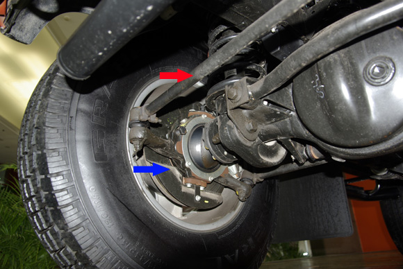 ????上圖為前軸轉(zhuǎn)向系統(tǒng)特寫,紅色箭頭為轉(zhuǎn)向拉桿,它負責拉動前輪產(chǎn)生左右的轉(zhuǎn)向。衛(wèi)士的轉(zhuǎn)向機構比較特別,其羊角與硬軸直接采用了球頭的連接方式(藍色箭頭所指),整個羊角包裹住球頭,可以產(chǎn)生任意方向的旋轉(zhuǎn),這比起傳統(tǒng)的靠上下轉(zhuǎn)點定位旋轉(zhuǎn)的前軸,前輪的傾角和束角能在更大的范圍內(nèi)活動。