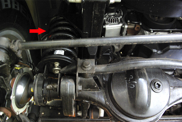 ????衛(wèi)士的后軸采用拖臂式后懸,紅色箭頭所指的拉桿就是拖臂。左右各一根,拖臂及避震機對后軸的自由度進行控制,后軸相對車架的位置和自身的扭轉(zhuǎn)都得到了控制。