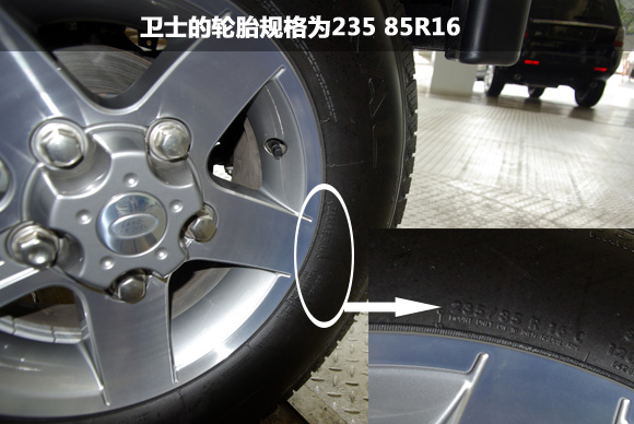 ????衛(wèi)士冰火版的輪胎采用了扁平比厚達85的輪胎,胎寬為235mm,純粹的越野取向,粗大的輪胎顆??梢詰獙σ巴飧鞣N地面條件,依然提供可靠的抓地,但面對城市中的柏油路面,則不一定能提供良好的抓地。