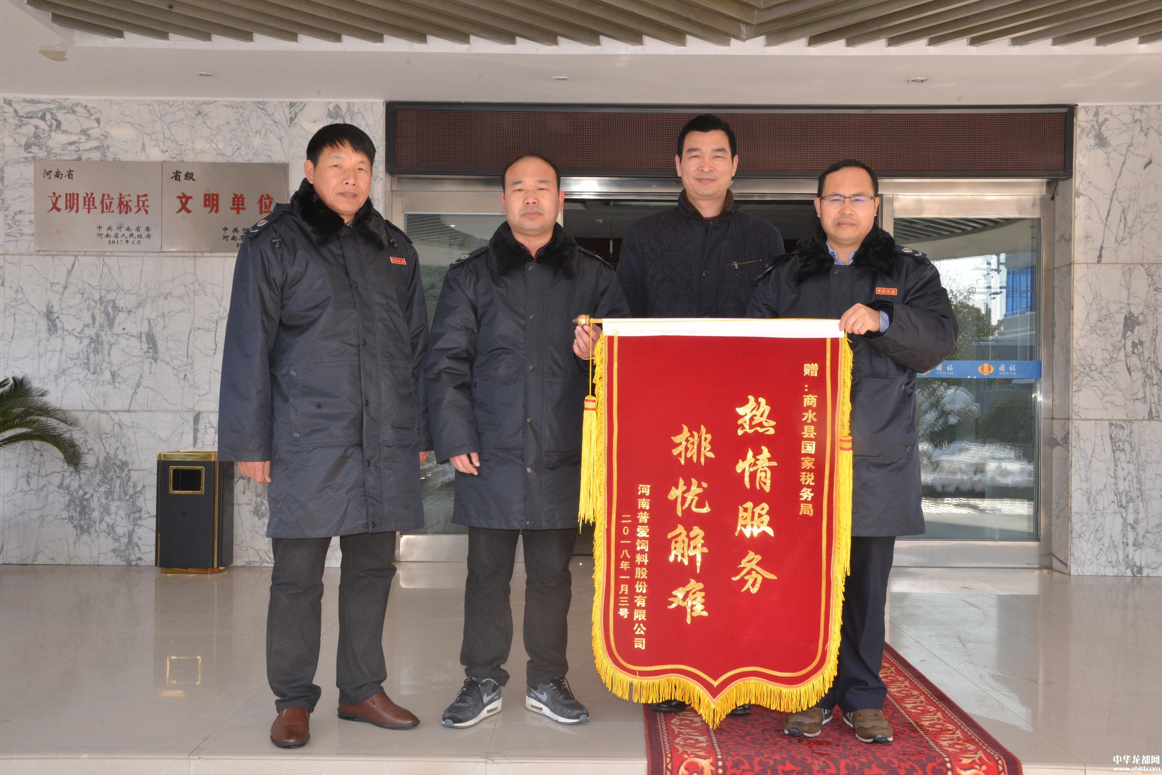 中華龍都網(wǎng)訊(周口報業(yè)全媒體記者 付永奇 通訊員 李媛媛)1月8日,河南普愛飼料股份有限公司的財務(wù)人員將一面印有“熱情服務(wù)排憂解難”的錦旗送到商水縣國稅局,感謝辦稅服務(wù)廳工作人員急納稅人之所急、想納稅人之所想,為他們提供細(xì)致、周到、高效的辦稅服務(wù)。