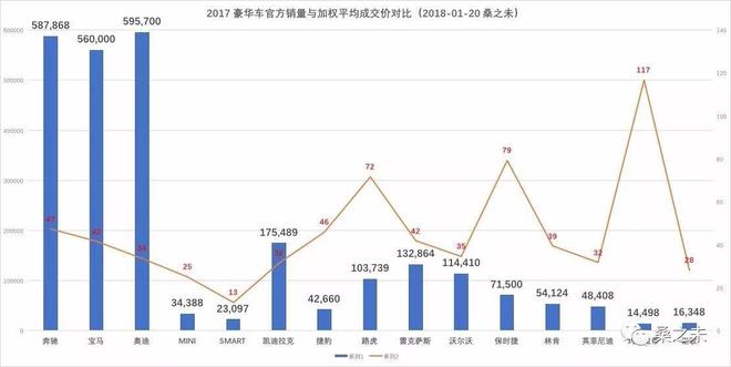 銷售的數(shù)量固然重要,但是銷售質(zhì)量也是評(píng)估銷售力不能忽視的重要指標(biāo)。衡量銷售質(zhì)量,“加權(quán)平均成交價(jià)”和“單車?yán)麧?rùn)”這兩個(gè)重要參數(shù),也許讓我們更直觀的看到車企的銷售能力與經(jīng)銷商單店經(jīng)營(yíng)質(zhì)量。這些更微觀的數(shù)據(jù)往往更能反映銷售公司及其經(jīng)銷商體系的銷售能力及水平。“加權(quán)平均成交價(jià)”反映車企的產(chǎn)品力與銷售公司的銷售能力,車企賣掉的車越多,單車價(jià)格越貴,品牌就越具有競(jìng)爭(zhēng)力,反之就需要考慮改進(jìn)產(chǎn)品,提升銷售管理能力?!皢诬?yán)麧?rùn)”指經(jīng)銷商銷售新車獲取的利潤(rùn),不含衍生利潤(rùn),一般在-4%-7%之間,如果單車?yán)麧?rùn)超過(guò)-2%,廠家需要考慮對(duì)經(jīng)銷商進(jìn)行補(bǔ)貼,如果利潤(rùn)超過(guò)7%,車企就會(huì)調(diào)整經(jīng)銷商浮動(dòng)返利。下面我們通過(guò)這兩個(gè)指標(biāo),來(lái)看哪些豪華車品牌在2017年表現(xiàn)更具實(shí)力。