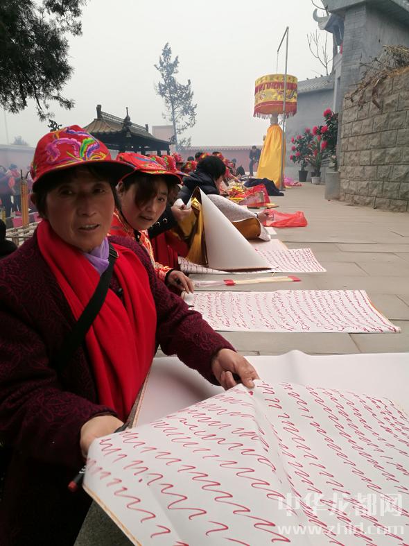 大霧的確延緩了香客的腳步,這也讓晚來(lái)的記者得以看到祭拜的盛景。女媧陵前,十幾名身著統(tǒng)一緞面紅襖,穿黑棉布鞋的女客正在結(jié)伴焚香祭拜,口音明顯和當(dāng)?shù)厝瞬煌?。她們是從距西華300多公里的濮陽(yáng)范縣、臺(tái)前縣來(lái)的,說(shuō)是凌晨2時(shí)就起身出發(fā),大霧中不僅遭遇堵車,還迷了路,到女媧城都快8時(shí)了。她們這次一起來(lái)的有30多人,分乘4輛車。就像往常前來(lái)一樣,她們?cè)谂畫z城要焚香、跪拜、“寫賬”(在紙上畫符,敬奉女媧的一種民間形式)、“守功”(在大殿靜坐,以示對(duì)女媧親近),直至下午方回?!拔覀兠磕炅鲁跻缓团D月初一都來(lái),為啥?信奉女媧娘娘唄,不來(lái)不舒服?!逼渲幸晃豢仔障憧透嬖V記者。