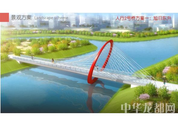 人行2號(hào)橋的設(shè)計(jì)方案有兩套,分別為“旭日東升”和“氣貫長(zhǎng)虹”?!靶袢諙|升”為圓形塔懸索橋。記者從效果圖中看到,該橋的橋塔為圓形,猶如一輪?wèn)|升的太陽(yáng),象征著城鄉(xiāng)一體化示范區(qū)蓬勃發(fā)展的未來(lái)?!皻庳為L(zhǎng)虹”為中承式系桿拱橋。該方案結(jié)合中國(guó)玉帶橋的古典元素、抽象古典幾何美學(xué),采用現(xiàn)代的設(shè)計(jì)手法,創(chuàng)作出現(xiàn)代感和中國(guó)傳統(tǒng)橋梁元素雜糅的橋梁設(shè)計(jì)。