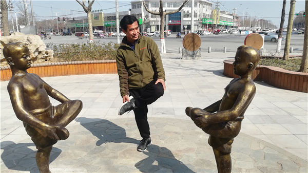 在表現(xiàn)兒童游戲“斗雞”的雕塑前,兩個(gè)光背孩童獨(dú)腿站立,分別搬著另一條腿作戰(zhàn)斗準(zhǔn)備。那生動(dòng)的畫(huà)面,令40多歲的市民尚巖青忍俊不禁,他也獨(dú)腿站在雕塑中間,像個(gè)開(kāi)心的孩子一樣,搬著腿和雕塑中的頑童組成一起斗雞的場(chǎng)景。