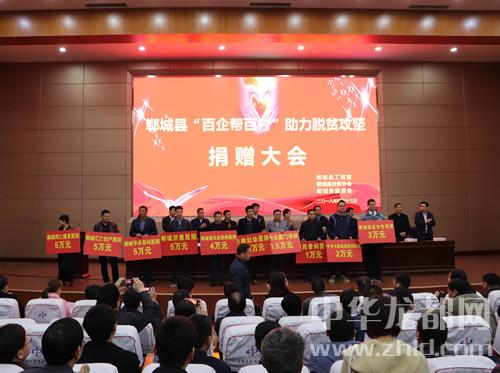 中華龍都網(wǎng)訊(周口報業(yè)全媒體記者 徐松 文/圖)4月13日,鄲城縣召開“百企幫百村”助力脫貧攻堅捐贈大會,全縣129家企業(yè)反哺社會助力脫貧攻堅,現(xiàn)場捐贈近1300萬元。鄲城縣四個班子領(lǐng)導(dǎo)、部分縣處級領(lǐng)導(dǎo)干部、縣慈善會會長、縣扶貧協(xié)會會長、縣直各單位和鄉(xiāng)鎮(zhèn)負(fù)責(zé)人等參加捐贈大會??h委書記羅文閣發(fā)表講話,縣長李全林主持會議。