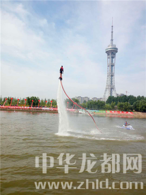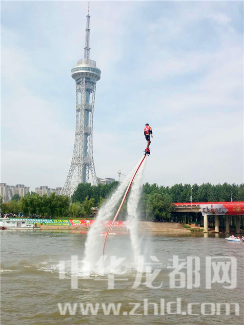 開(kāi)幕式上,大賽組委會(huì)請(qǐng)來(lái)的“水上飛人“表演令觀眾驚嘆不已,只見(jiàn)一名運(yùn)動(dòng)員腳下踩著特制的噴水裝置,猶如鋼鐵俠一般,從水中騰空而起,時(shí)而在半空中靜止不動(dòng),時(shí)而從空中飛魚(yú)入水,連續(xù)做出前后空翻、空中回旋、蛟龍出水等各種華麗特技,令觀眾尖叫雀躍。期間,水上兩艘快速疾飛的船模表演,以及空中翻飛自若的航模表演,都給觀眾帶來(lái)了不一樣的視覺(jué)感受。