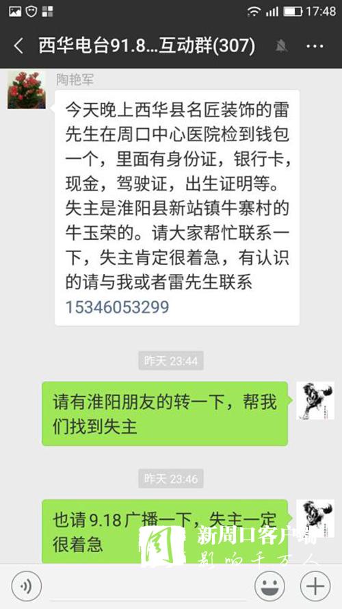 很快,一條尋找失主的愛心信息,便通過無線網(wǎng)絡(luò),乘著夜色翅膀,在豫東大地的西華縣政協(xié)群、西華縣非公黨工委群、西華縣城市管理群、西華縣愛心粥屋群、西華電臺91.8互動群、周口市個私協(xié)會系統(tǒng)群、淮陽縣非公黨工委群、淮陽縣文明辦群、淮陽縣城市管理群等微信群迅速散發(fā)開來。很多群友進行轉(zhuǎn)發(fā)、點贊。