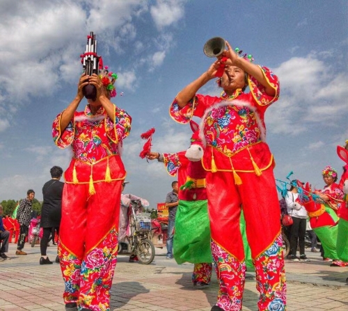 廣場(chǎng)上,一排排碩大的紅氫氣球高懸,氣球下縣掛著祝賀農(nóng)民豐收節(jié)的標(biāo)語(yǔ)。穿著各種鮮艷顏色的表演服裝的民間藝術(shù)表演隊(duì),給節(jié)日增光添彩,擂響盤鼓,為節(jié)日助威。從全縣23個(gè)鄉(xiāng)鎮(zhèn)起早趕來(lái)的46支民間藝術(shù)表演隊(duì)伍,伴隨著悠揚(yáng)的音樂(lè),喧天的鑼鼓在廣場(chǎng)上各顯其能。腰鼓、盤鼓、耍獅子、劃旱船、抬花轎、挑花籃、廣場(chǎng)舞也以不同的方式表達(dá)著豐收的喜悅。