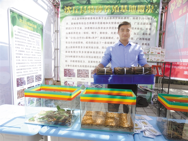 9月22日,沈丘縣舉辦第一個(gè)中國農(nóng)民豐收節(jié)慶?;顒?dòng),來自全縣22個(gè)鄉(xiāng)鎮(zhèn)(辦事處)的35家農(nóng)民種植、養(yǎng)殖合作社和家庭農(nóng)場,展示了槐山藥、黃金梨、冬棗、木瓜、“袖珍”黃瓜、活體蜈蚣、蝎子等120余個(gè)品種。