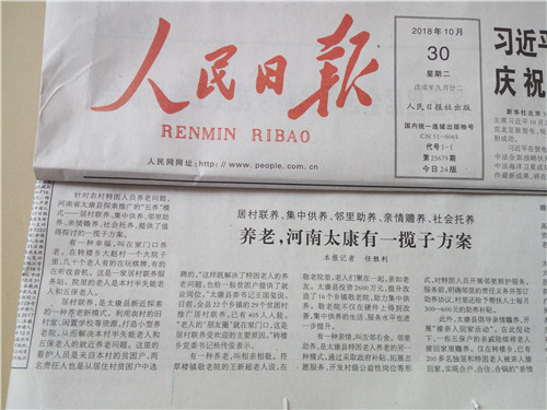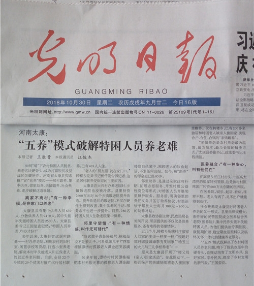 為助力脫貧攻堅(jiān),有效提高農(nóng)村特困老人整體供養(yǎng)水平,太康縣民政局、縣扶貧辦等部門在縣委、縣政府正確領(lǐng)導(dǎo)下,按照“一戶一策、一人一法”原則,創(chuàng)新實(shí)施集中供養(yǎng)、親情贍養(yǎng)、社會(huì)托養(yǎng)、居村聯(lián)養(yǎng)、鄰里助養(yǎng)“五養(yǎng)”模式,有效破解了特困老人的脫貧和養(yǎng)老難題。該做法經(jīng)《周口日?qǐng)?bào)》率先報(bào)道后,國(guó)家級(jí)、省級(jí)媒體紛紛慕名前往太康采訪。截至目前,百余家媒體或網(wǎng)站相繼報(bào)道了太康“五養(yǎng)”模式。10月30日,《人民日?qǐng)?bào)》《光明日?qǐng)?bào)》分別以《養(yǎng)老,河南太康有了一攬子方案》《河南太康:“五養(yǎng)”模式破解特困人員養(yǎng)老難題》為題重磅介紹了太康“五養(yǎng)”模式經(jīng)驗(yàn)。10月30日,人民日?qǐng)?bào)海外版官方網(wǎng)站還以《河南太康:“五養(yǎng)”模式來(lái)了 特困人員笑了》為題作了報(bào)道。據(jù)了解,國(guó)家級(jí)3家主流媒體同一天內(nèi)報(bào)道同一工作經(jīng)驗(yàn),在太康縣宣傳史上尚屬首次。