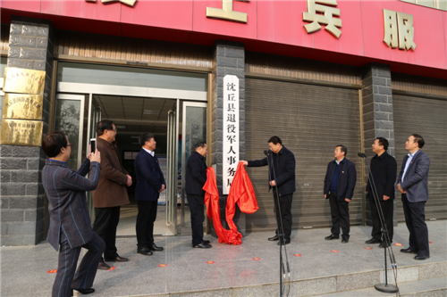 沈丘縣委常委、常務副縣長郝四春與縣委常委、縣政府黨組成員馬偉共同為縣退役軍人事務局揭牌。