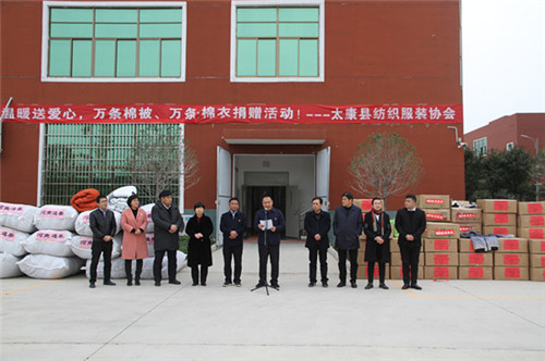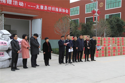 太康縣委副書記、政法委書記王程清在致辭中指出,扶貧濟(jì)困、樂善好施是中華民族的傳統(tǒng)美德,通泰紡織、銀鑫棉業(yè)、萬利源棉業(yè)等縣紡織協(xié)會成員單位通過捐款捐物、產(chǎn)業(yè)幫扶、就業(yè)幫扶、基礎(chǔ)設(shè)施幫扶等多種形式投入到脫貧攻堅(jiān)行動中,幫助貧困群眾發(fā)展生產(chǎn)、改善生活條件、擺脫疾病困擾、完成學(xué)業(yè)夢想、為貧困群眾早日脫貧貢獻(xiàn)出自己的一份力量,并為他們捐贈棉衣棉被的善舉表示感謝。