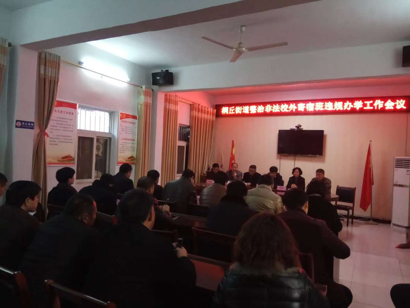 與會人員首先收看了桐丘街道排查非法校外寄宿班安全隱患專題片??h消防大隊指導(dǎo)員李廣華通報城區(qū)非法校外寄宿班情況??h教體局副主任科員李軍峰對各中小學(xué)開展非法校外寄宿班整治工作提出具體工作要求。桐丘街道黨工委書記萬群玲對非法校外寄宿班存在的安全隱患進行詳細(xì)講解,對紅旗小學(xué)采取的得力措施表示肯定,并對下步工作作出安排部署。