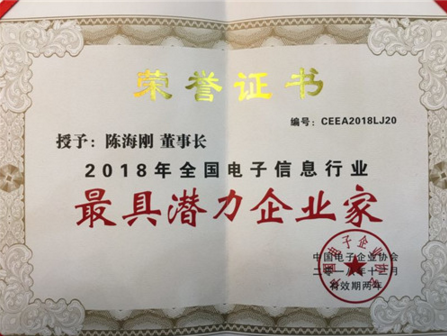 在當(dāng)日下午召開的全國電子信息行業(yè)優(yōu)秀企業(yè)家表彰大會(huì)上,公司董事長(zhǎng)陳海剛榮獲“2018年全國電子信息行業(yè)最具潛力企業(yè)家”榮譽(yù)稱號(hào)。