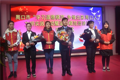 市公安局交警王凱偉是2018年敬業(yè)奉獻(xiàn)類中國好人,省五四獎?wù)芦@得者,經(jīng)常參加公益活動,持續(xù)幫助貧困女孩小夢麗和她家人,用善舉挽救了這個貧困家庭。扶溝縣曹里鄉(xiāng)刁灣小學(xué)教師李艷琴扎根鄉(xiāng)村教育一線無怨無悔,數(shù)年如一日照顧癱瘓在床的婆婆任勞任怨,曾獲縣最美鄉(xiāng)村老師稱號。鹿邑伯陽中學(xué)“90后”女教師劉交交剛參加完高考后父親因病去世,母親身患?xì)埣?。她不向命運低頭,靠打工收入和微薄的助學(xué)金維持生活和學(xué)業(yè),為照顧母親,她攜母上大學(xué),曾獲中國大學(xué)生自強之星等稱號,被授予省五四獎?wù)隆H坏赖履7峨m然都是最平凡的人,但都有一顆不平凡的心,他們的感人事跡散發(fā)著奪目的光芒,深深感染了現(xiàn)場的每一位聽眾,不少人流下了感動的淚水。