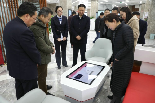 調(diào)研組一行首先來(lái)到商水農(nóng)商銀行陽(yáng)城支行查看“普惠+數(shù)字”銀行建設(shè)情況。陽(yáng)城支行行長(zhǎng)簡(jiǎn)要介紹該網(wǎng)點(diǎn)基本情況、服務(wù)理念后,引導(dǎo)調(diào)研組一行依次參觀了普惠授信服務(wù)區(qū)、數(shù)字智能服務(wù)區(qū)、電子銀行體驗(yàn)區(qū)、保管箱服務(wù)區(qū)、貴金屬服務(wù)區(qū)等特色功能區(qū),并詳細(xì)介紹了每個(gè)功能區(qū)的作用和特點(diǎn)。調(diào)研組一行現(xiàn)場(chǎng)體驗(yàn)了智能導(dǎo)覽臺(tái) 、客戶互動(dòng)桌等智能設(shè)備,對(duì)該網(wǎng)點(diǎn)定位準(zhǔn)確、理念前衛(wèi)、設(shè)備先進(jìn)、功能齊全、分區(qū)合理,為客戶提供全方位的金融服務(wù)表示贊賞。