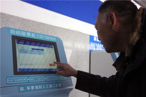 1月20日,旅客在周口火車(chē)站自動(dòng)售票機(jī)取票。記者 金月全 攝