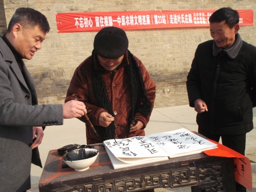 鄧城鎮(zhèn)范莊村72歲的范長印老人觀展后感觸頗深地說:“這些展品我很多都見過、用過,不過用起來真費(fèi)勁真受罪??!現(xiàn)在農(nóng)忙季節(jié)機(jī)器一響,糧食嘩啦啦就進(jìn)家了。我這個(gè)年齡的人最能體會(huì)到咱們國家的進(jìn)步和社會(huì)的美好!”隨后,老人在留言薄上用握慣農(nóng)具的粗糙大手握起毛筆寫下了“新時(shí)代,得民心”幾個(gè)字。字雖不工整但他的滿腔真情感動(dòng)了在場的群眾,大家把熱烈的掌聲送給范長印老人。