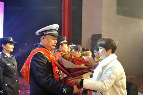 晚會(huì)現(xiàn)場,頒獎(jiǎng)環(huán)節(jié)和文藝節(jié)目輪番呈現(xiàn),精彩紛呈。由32個(gè)民警子女上演的情景劇《天之大》,警寶們用稚嫩的聲音唱出了警察家庭的付出和他們對(duì)父母的愛,讓現(xiàn)場觀眾流下感動(dòng)的淚水;最后一個(gè)頒獎(jiǎng)環(huán)節(jié),當(dāng)15名警嫂手捧鮮花獎(jiǎng)杯走上舞臺(tái)為他們從警10年、20年、30年的愛人頒獎(jiǎng)時(shí),整個(gè)舞臺(tái)愛意濃濃。