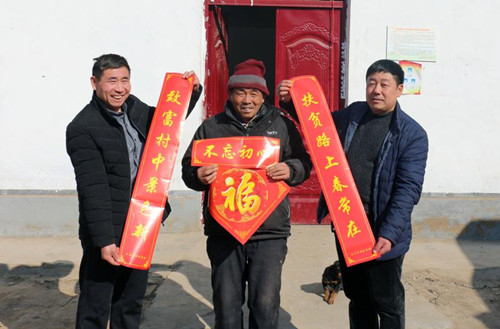 1月24日,扶溝縣白潭鎮(zhèn)王村貧困戶王奎鎖喜滋滋地從縣財政局扶貧工作人員手中接過對聯(lián)。為營造歡樂祥和、文明有序的節(jié)日氛圍,宣傳扶貧政策,扶溝縣財政局對所幫扶7個行政村開展“情暖萬家·迎新春送春聯(lián)”助力脫貧攻堅活動,以此傳達(dá)黨的十九大精神和脫貧攻堅精神。