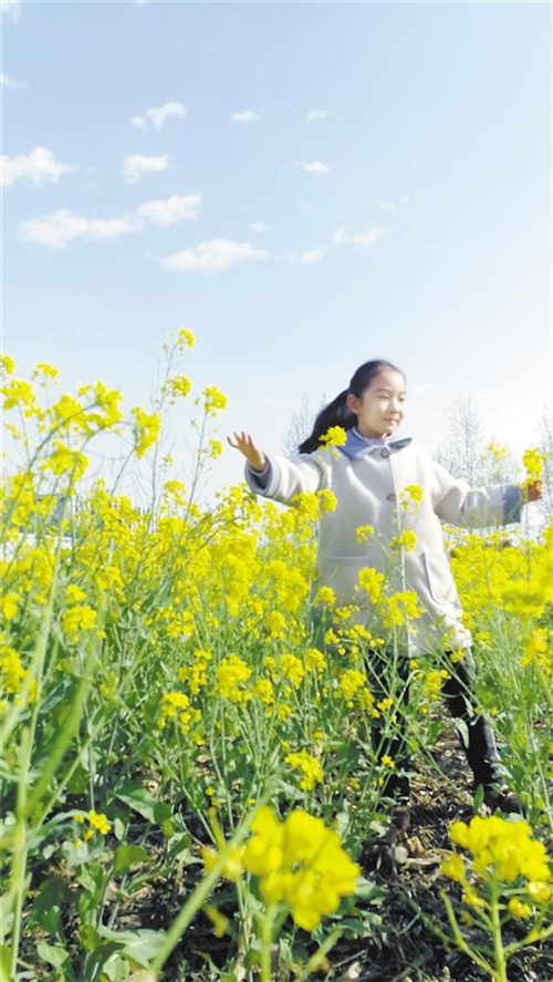 3月31日,記者在中心城區(qū)慶豐路與政通路交叉口附近看到,一位市民帶著孩子在盛開的油菜花里游玩、拍照,盡享春日美景。記者 關(guān)秋麗 攝