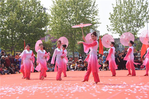 比賽進(jìn)行到將近一半時(shí)候,縣第二實(shí)驗(yàn)小學(xué)參賽隊(duì)帶來(lái)的舞蹈《麗人行韻》將大賽推向了高潮。表演開(kāi)始,身著天藍(lán)漸變色長(zhǎng)裙的38名姑娘手持彩傘一字列隊(duì)緩步入場(chǎng),正當(dāng)觀眾們看得入神時(shí),她們突然將彩傘都齊刷刷地舉過(guò)頭頂并瞬間打開(kāi),無(wú)數(shù)粉紅色的花瓣從彩傘中紛紛飄落,像從碧藍(lán)的天空中下起了無(wú)盡的花瓣雨。選手們短短幾秒鐘的舉動(dòng),在廣場(chǎng)上勾勒出了一個(gè)人間仙境,引人入勝。在粉紅花瓣的映襯中,傘下腳步輕盈的女子們微微舞動(dòng),美若天仙,婀娜多姿,展現(xiàn)了“人面桃花相映紅,桃花依舊笑春風(fēng)”的作品主題。