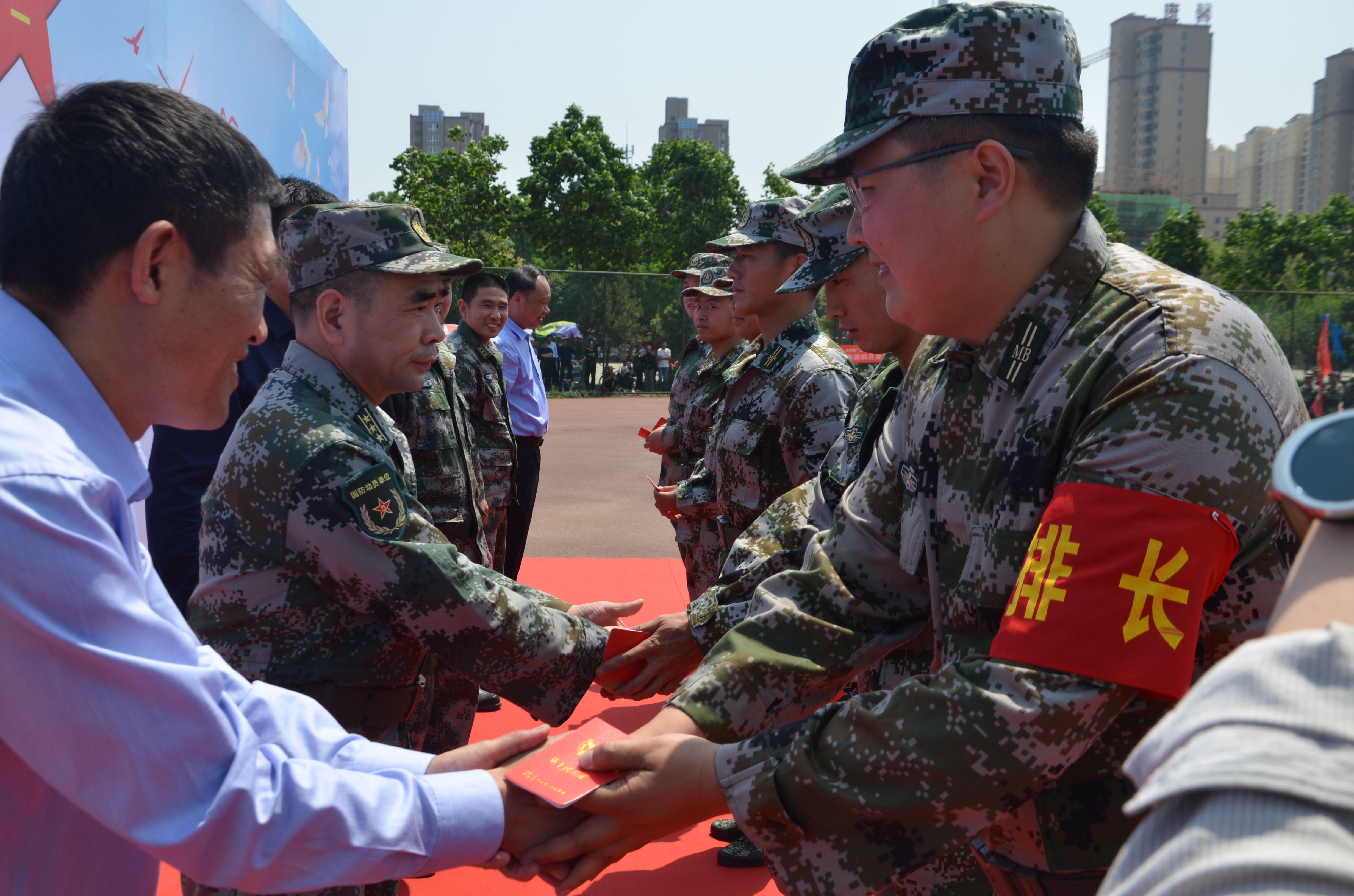 大會(huì)在雄壯的《解放軍軍歌》中拉開(kāi)了序幕。縣委常委、人武部政委曹新旺宣布基干民兵排以上干部任職命令,縣委常委、常務(wù)副縣長(zhǎng)郝四春代表縣委、縣政府、縣人武部為基干民兵分隊(duì)授旗,綜合應(yīng)急連指導(dǎo)員、縣人武部政工科長(zhǎng)李紅藝帶領(lǐng)全體民兵面對(duì)國(guó)旗宣讀民兵誓詞。在場(chǎng)領(lǐng)導(dǎo)向民兵代表發(fā)放了基干民兵證和入隊(duì)通知書(shū),民兵代表和教練員代表分別進(jìn)行了表態(tài)發(fā)言。