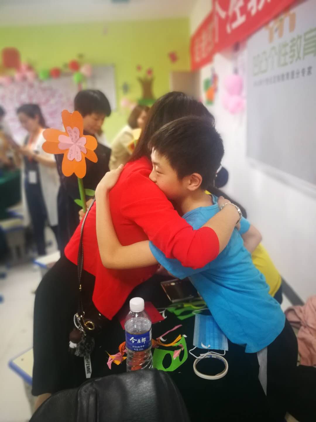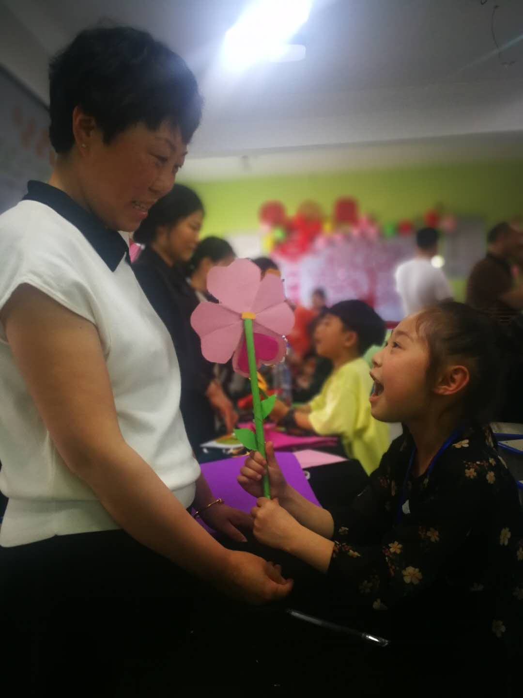 活動上,在專業(yè)手工教師的指導以及媽媽的配合下,這些小記者自己動手利用剪刀、雙面膠、彩紙等學習制做康乃馨紙花。五層紅色的花瓣、兩片綠葉、一根花枝,經過近一個小時的反復實踐,一朵朵紙花陸續(xù)制好,成功的喜悅映紅了孩子們的笑臉。在祝??ㄆ蠈懴聦寢尩淖8UZ后,孩子們手捧用彩紙包裝好的紙花,拿著祝福卡送到母親手中,和媽媽熱情擁抱、向媽媽表達愛的祝福。