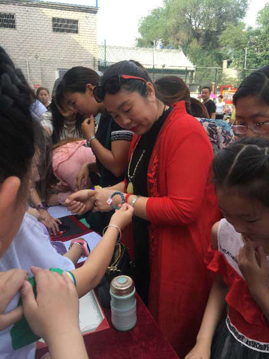 5月25日上午,沈丘縣中國結(jié)第七代傳承人李?;ㄗ哌M槐店鎮(zhèn)回民小學,和學校“中國結(jié)”手工編織興趣班的20名學生舉行“愛心義賣,情暖校園”主題活動。不到半小時,100多件作品被搶購一空還預(yù)定了很多。據(jù)悉,這次義賣共得到1200余元,將全部捐給“槐店鎮(zhèn)中心學校教育基金”,用來資助該鎮(zhèn)經(jīng)濟困難師生、獎勵優(yōu)秀教師和學生、資助教育教研等重大活動項目。