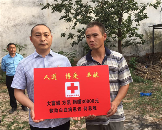 一次偶然的機(jī)會(huì),“感動(dòng)周口十大人物”、“周口市十大慈善人物”方凱得知何恩雅的情況后,便想前往她的家里,了解病情,慷慨解囊。這位周口凱盛實(shí)業(yè)的董事長(zhǎng),素以慈善為懷,10多年來拿出800多萬元,堅(jiān)持幫助困難群眾。