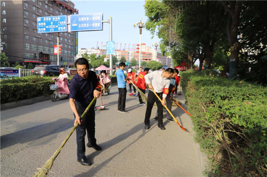 6月4日,烈日炙烤著大地,氣溫升至37攝氏度,路面溫度更高。鄲城縣財政局長張振新帶領(lǐng)“創(chuàng)衛(wèi)”值班人員,正在新華路西段責(zé)任區(qū)內(nèi)清掃路面、撿拾落葉、噴灑花木、落實“門前五包”……大家忙得汗流浹背,始終無一人脫崗。