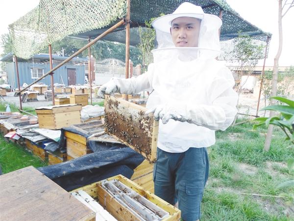 6月24日,沈丘縣付井鎮(zhèn)九里村的退伍軍人蘇尚方,正小心翼翼地從蜂箱里取出蜂蜜板,準備采收蜂蜜。“我養(yǎng)了120多箱蜜蜂,年產(chǎn)蜂蜜3000多公斤,經(jīng)濟收入十分可觀?!碧K尚方說,他專門成立了蘇家養(yǎng)蜂專業(yè)合作社,帶領(lǐng)當?shù)刎毨粢黄鹈撠氈赂?。謝辛凌 攝