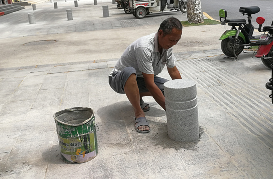 7月9日上午,工人正在八一大道兩側(cè)的人行道上安裝隔離石樁。為杜絕機(jī)動(dòng)車(chē)占用人行道,相關(guān)部門(mén)近日陸續(xù)在中心城區(qū)多條主干道兩側(cè)的人行道上安裝隔離石樁。市民紛紛表示,安裝隔離石樁讓人行道更通暢了,也使城市更有序了。 記者 關(guān)秋麗 攝