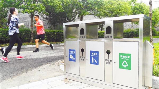 日前,周口公園把原來的綠色塑料垃圾桶全部換成不銹鋼分類垃圾桶。記者在現(xiàn)場看到,該垃圾桶中間有“外包裝物”“瓶罐類”“其他垃圾”3個(gè)投放口,兩側(cè)設(shè)有“滅煙口”,方便市民分類投放垃圾。