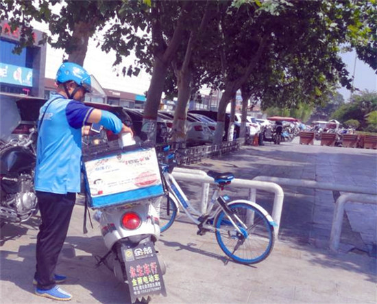 七一路五一文化廣場旁,一名外賣小哥接餐后準(zhǔn)備出發(fā)。