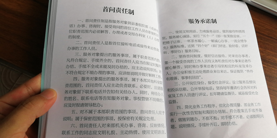 制度規(guī)定,服務(wù)對(duì)象到縣委組織部辦事、咨詢或來電時(shí),首個(gè)接待的工作人員必須熱情、禮貌、耐心接待辦理或引領(lǐng)交給相關(guān)職責(zé)科室辦理。凡符合規(guī)定,手續(xù)齊全的,限時(shí)辦結(jié),手續(xù)不全未能及時(shí)辦結(jié)的,要主動(dòng)向服務(wù)對(duì)象說明原因……縣委組織部常務(wù)副部長薛斌告訴記者:“通過扎牢制度的籠子,讓部機(jī)關(guān)工作人員做到一張笑臉迎客,一把椅子讓座,一杯茶水暖心,一顆誠心辦事,一流業(yè)績爭先的服務(wù)標(biāo)準(zhǔn),切實(shí)達(dá)到門好進(jìn)、臉好看、話好聽,事好辦的目的?!?/p>