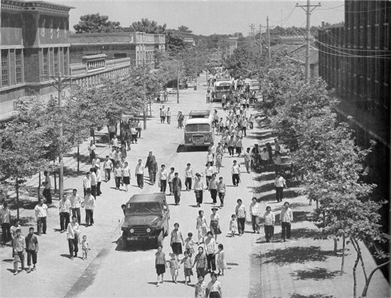 1975年6月,西華縣城唯一的一條硬化路面大街,現(xiàn)在的箕城路。 1975年5月,新華社一名攝影記者來到河南,從鄭州花園口到周口商水、西華、太康、扶溝、淮陽,歷時一個半月采訪拍攝黃泛區(qū)現(xiàn)狀。途徑地政府安排當(dāng)?shù)財z影家與其共同拍攝,周口攝影家葛慶亞、李中華、岳獻(xiàn)甫參與了拍攝。受政治環(huán)境影響,這批圖片推遲到1979年才集結(jié)成冊,由外文出版社分英文、法文、西班牙文三種語言出版。當(dāng)時,外文出版社隸屬出版總署,由中共中央宣傳部領(lǐng)導(dǎo),出版了大量的外宣圖書贈送外國駐華領(lǐng)事館。 (圖片來源:圖書《Former yellow river flood area transformed》中文名《黃泛區(qū)變化》)