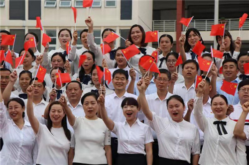 伴隨著琵琶悠揚(yáng)的旋律,在場(chǎng)人員揮舞手臂,舞動(dòng)國旗,共同唱響《我和我的祖國》。激情澎湃的歌聲響徹第二實(shí)驗(yàn)小學(xué)每一個(gè)角落,訴說著鄲城教育人對(duì)祖國的衷心熱愛和真誠歌頌。