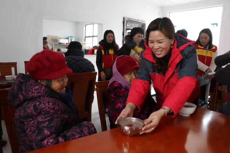 “開飯嘍!”中午時分,志愿者們將老人一一攙扶到餐廳坐下,隨后將一碗碗香氣四溢、且冒著熱氣的八寶粥端到老人跟前?!跋?,真香!”80歲的黃柏功老人舀了一勺八寶粥放到嘴里品了品笑著說。吃著八寶粥,老人想起了以前的艱苦生活,他禁不住激動地哭了起來:“以前,吃了上頓沒下頓,想吃一塊白面饃,都得等到過年??涩F(xiàn)在,天天不斷肉,生活越來越好。這都是共產(chǎn)黨給咱的福啊?!?/p>